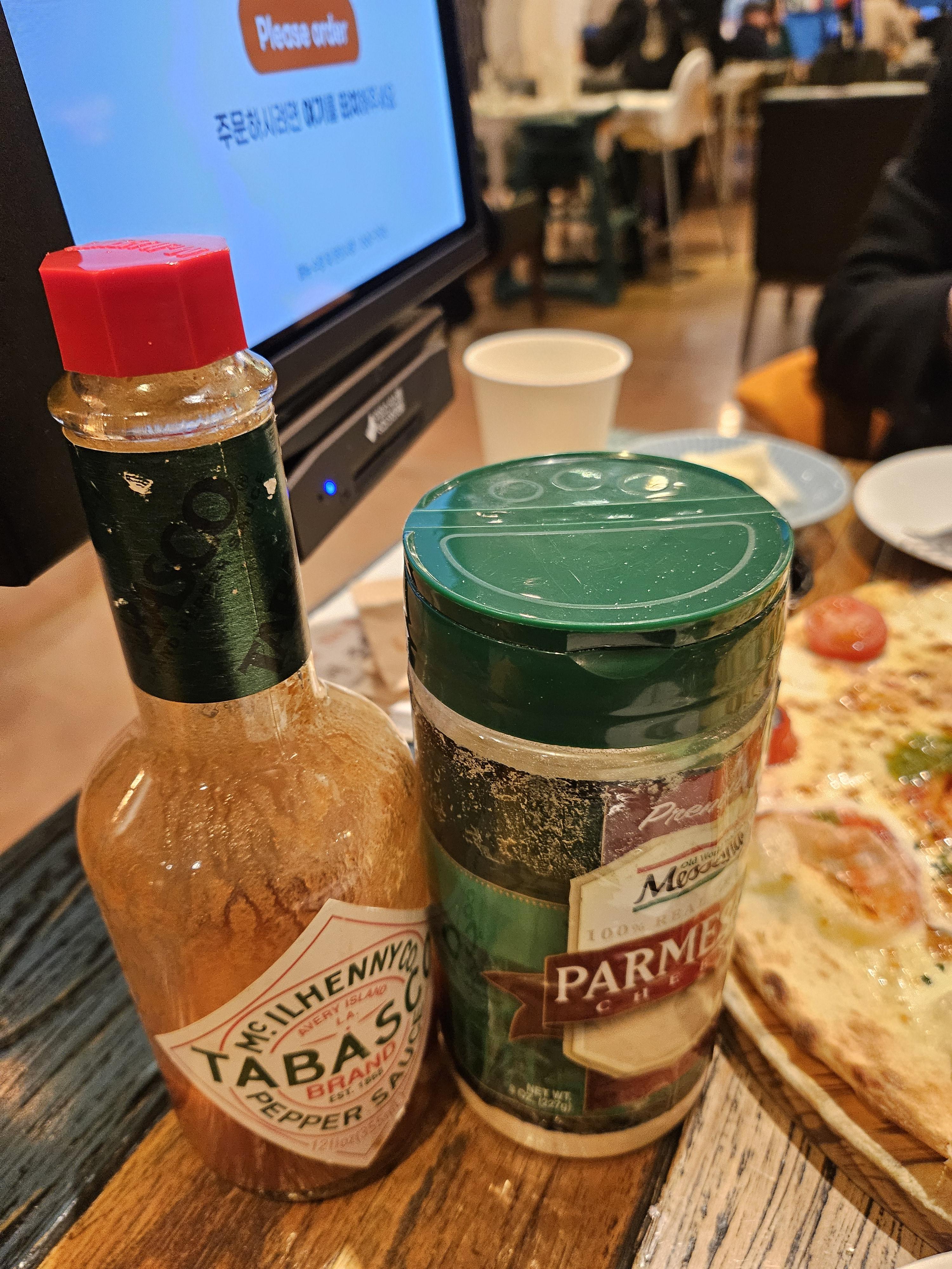 반반 피자를 시키면 치즈가루와 타바스코를 주신다